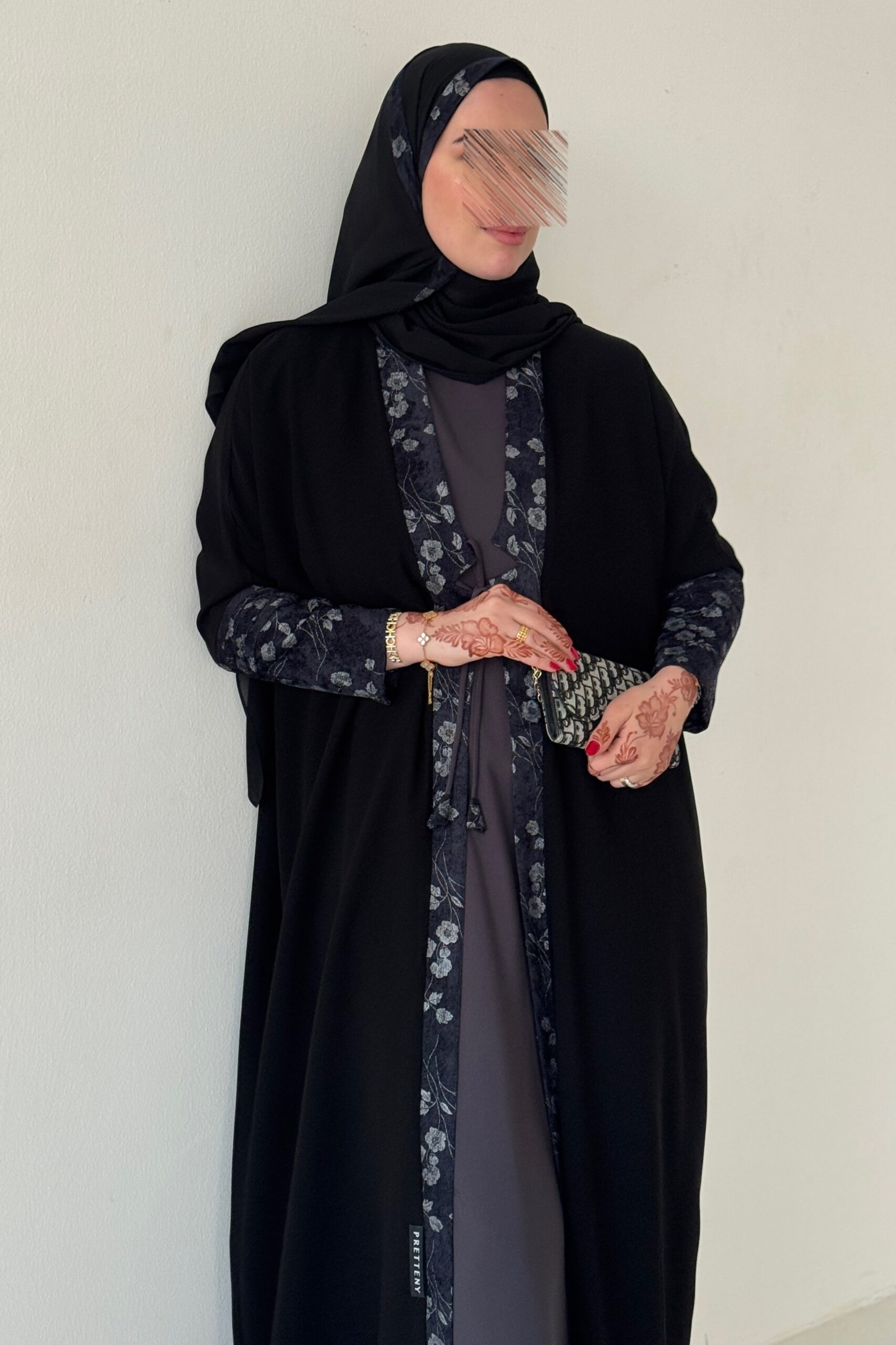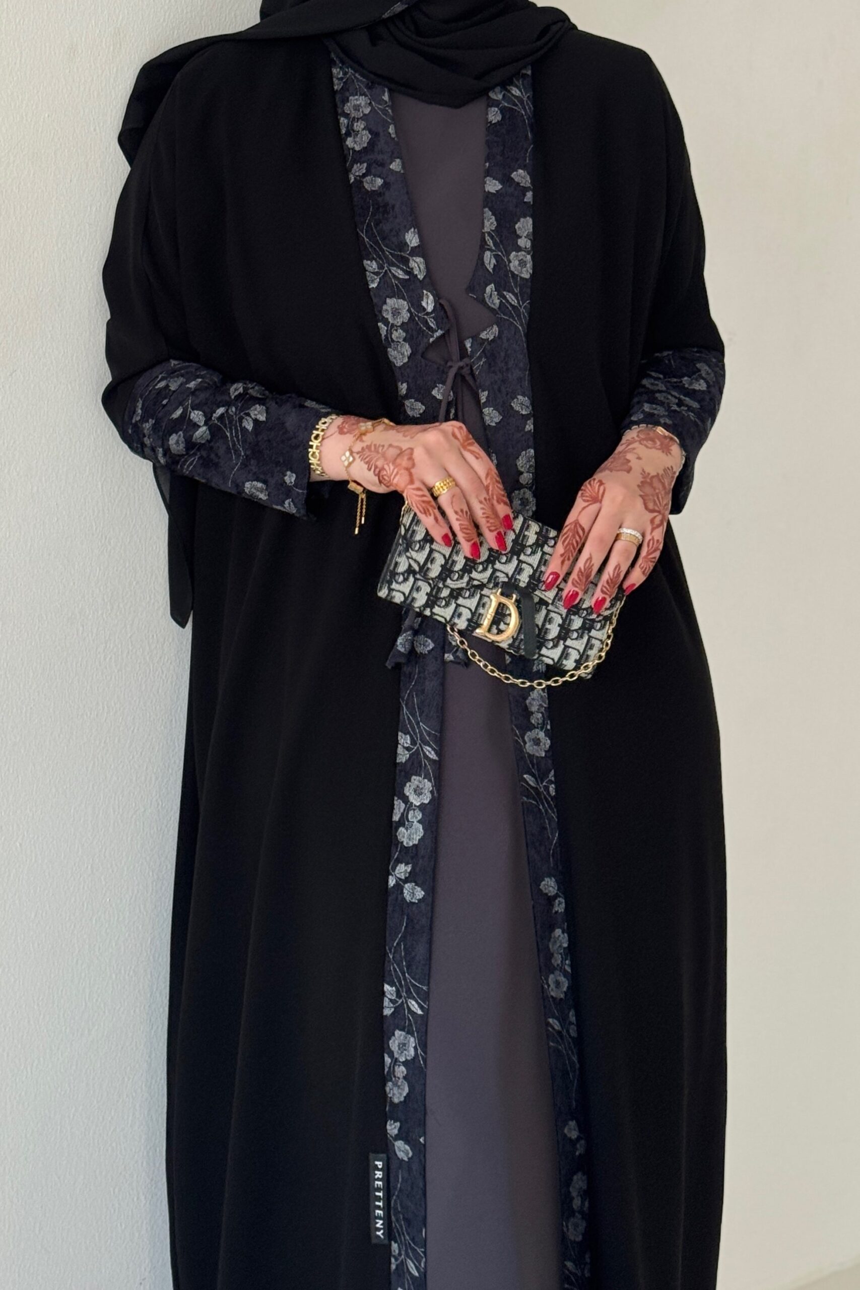- استخدمنا مخمل كحلي مشجر على الأكمام والعباية من الأمام
