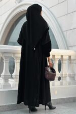 - خطوط من المخمل مشكوكة يدوياً على العباية من الأمام والخلف
