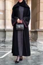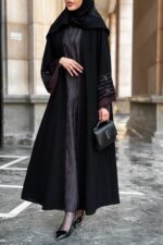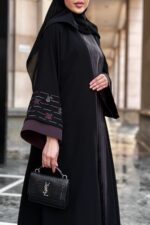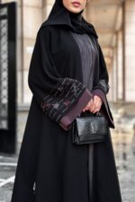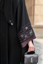 - تطريز باللون الرصاصي والعنابي على الأكمام والشيلة